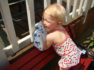 Katie Lee has decided to take up climbing this week. It doesn't matter the height, the structure, or how stable the object is. A few weeks ago, she climbed into the drawer under the oven. Then she climbed on the chair and ottoman at Mother and Daddy's. Yesterday, she decided to tackle the steps on the back and front porches (no pictures of that, I was too worried that she would fall off) and in her little car. Then today, she started the morning climbing on the cable box, then into the basket of toys, and then on the red rocker. She not only climbed in the rocker but then stood and clapped at her success. I wonder what will be next?