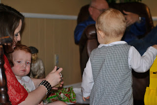 Ready for gifts. Katie Lee of course knew exactly what opening gifts was all about. The little boys was not as excited. I opened one for Daniel and they were both set to play. Part of Langdon's gift from us was a wooden stick horse. They both liked it but we had to move it because it became dangerous.