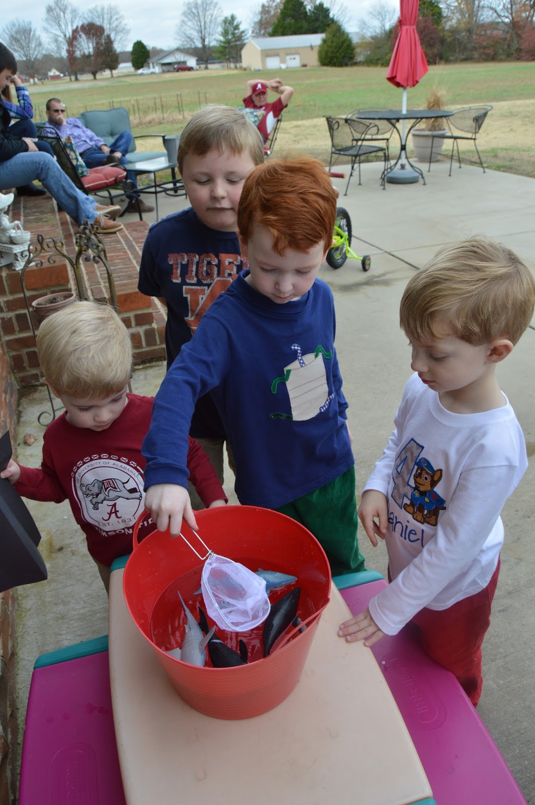 Caroline didn't mind it being a boy party. She was happy in her high chair with a dog bone cookie.